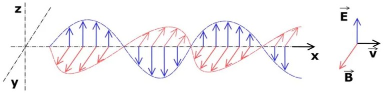 In the far-field region (beyond 3-4 wavelengths from the source antenna charges), RF-EMR waves become coherent and radiate as self-propagating, transverse, oscillating waves of Electric Fields and Magnetic Fields, as depicted in the diagram, above. The diagram shows an EMR wave propagating in the far-field region from left to right along the X axis. The Electric Field (E) in blue is in a vertical plane (along the Z axis) and the Magnetic Field (B) in red is in a horizontal plane (along the Y axis). Radiating Electric and Magnetic Fields in the far-field region are always in phase and oriented at 90 degrees to each other.